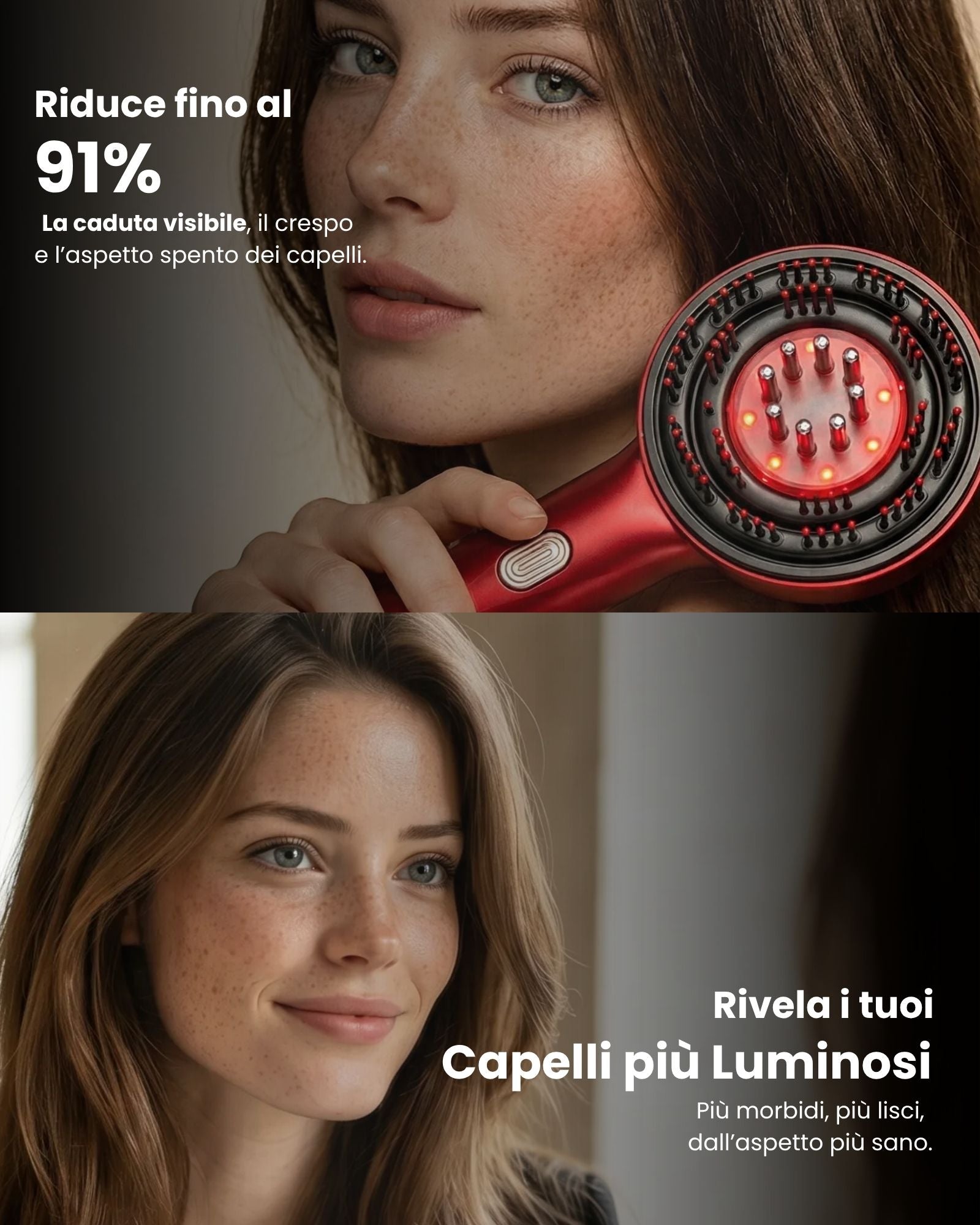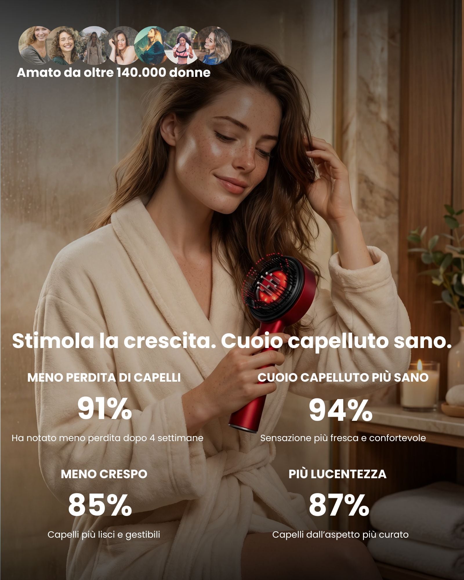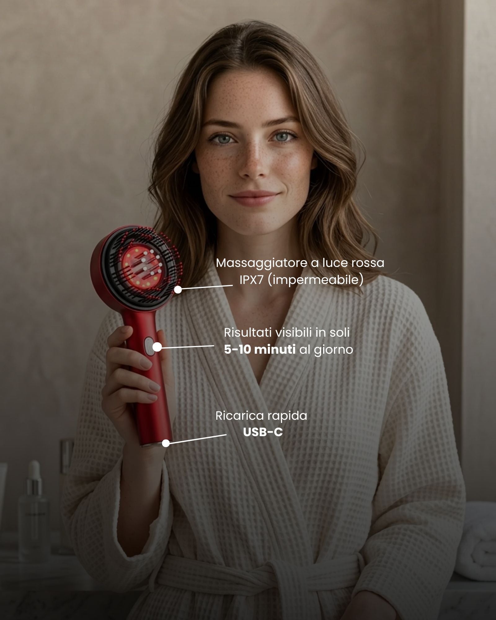 RossoLuce combina luce rossa a 850 nm, massaggio e infusione di olio per supportare una routine completa. La luce rossa aiuta a stimolare la microcircolazione; i punti massaggianti favoriscono il relax e supportano la circolazione; l’olio si distribuisce in modo uniforme mentre massaggi. Con l’uso costante, il cuoio capelluto appare più equilibrato e i capelli appaiono più forti e pieni.